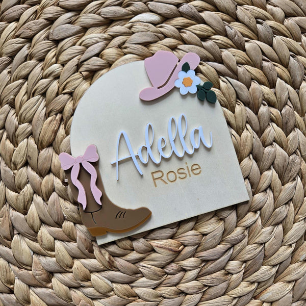 Welcome your new bundle of joy with our beautifully handcrafted cowboy Western floral wooden Baby girl name announcement sign. This personalized piece is the perfect addition to your nursery decor. Celebrate the arrival of your little one in style with a custom touch that will be cherished for years to come. A unique keepsake for your growing family.
