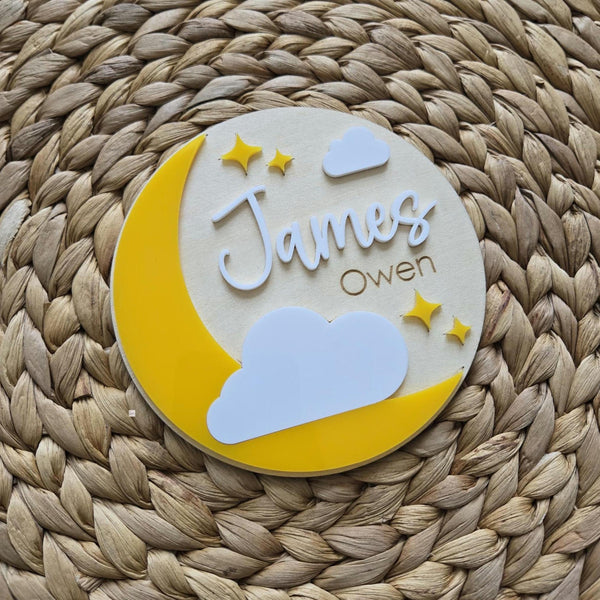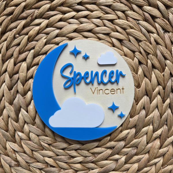 Welcome your new bundle of joy with our beautifully handcrafted wooden Moon and Stars birth announcement baby name sign. This personalized piece is the perfect addition to your nursery decor. Celebrate the arrival of your little one in style with a custom touch that will be cherished for years to come. A unique keepsake for your growing family.