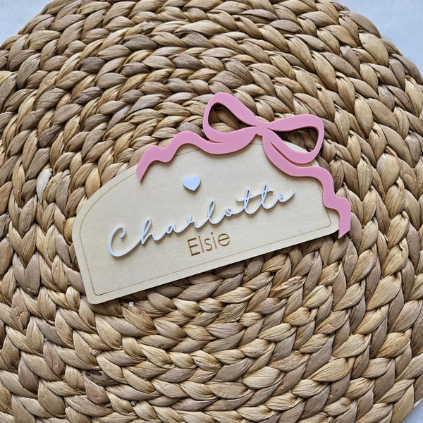 Made with wood and acrylic. Name and bow are cut using acrylic color of your choice.