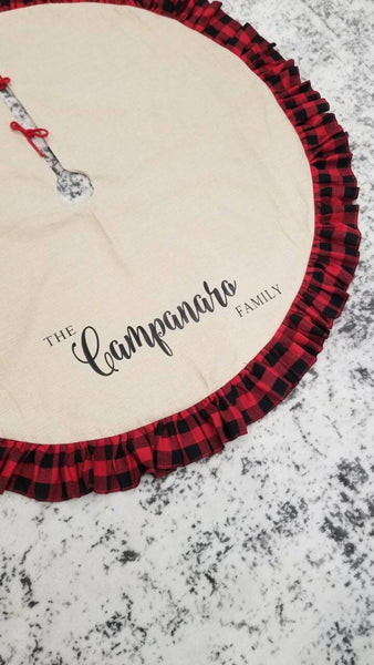 Personalized buffalo plaid red/black trim tree skirt is about 48".