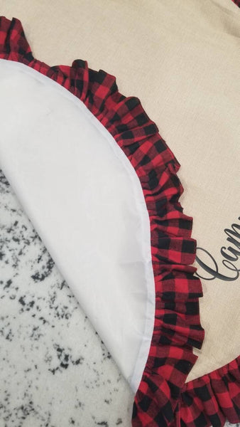 Plaid tree skirt is burlap and cotton material with a white lining on the back.