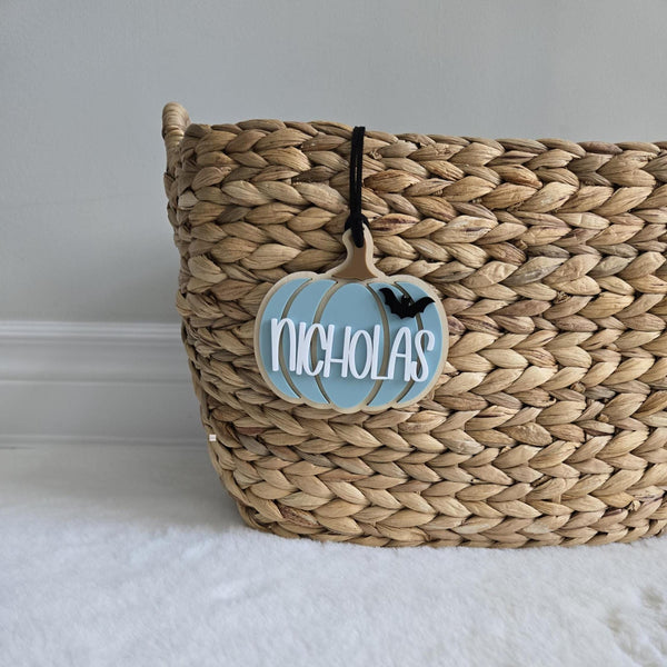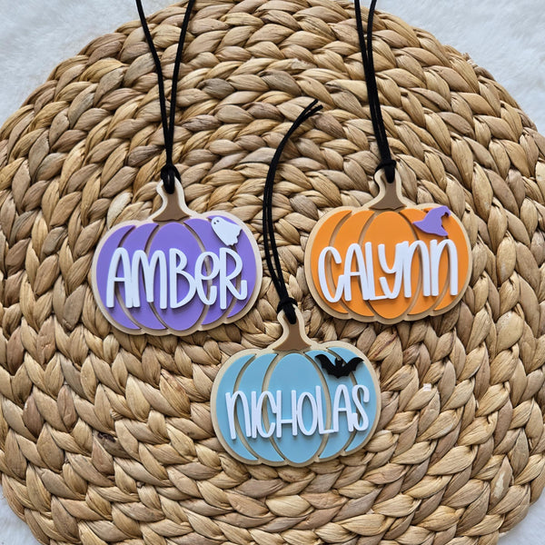 To order choose the pumpkin color you want and choose your own Halloween accent (bat, witch hat, ghost). Include the name you want in the personalization box! Name will be in white acrylic.