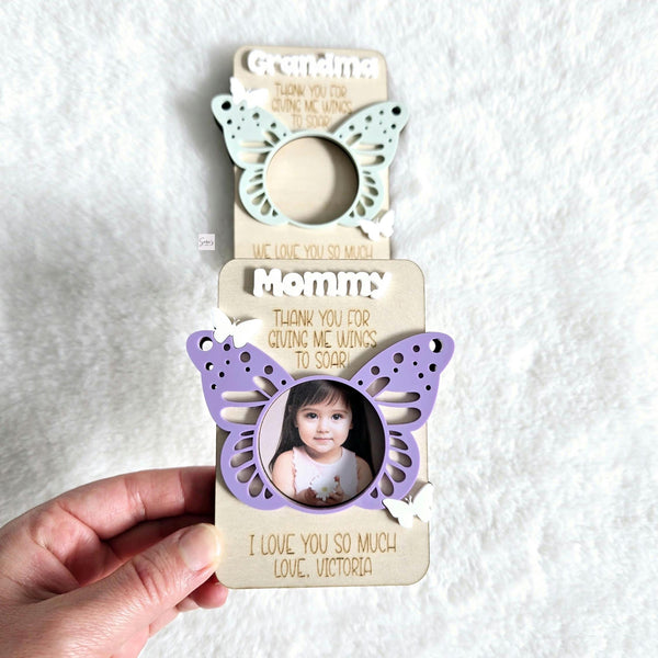 Magnet is cut from wood. Butterfly and name are cut using acrylic. You can choose the color of the butterfly in the middle(big butterfly). Smaller butterflies and title will be in white. Rest of the personalization will be engraved.