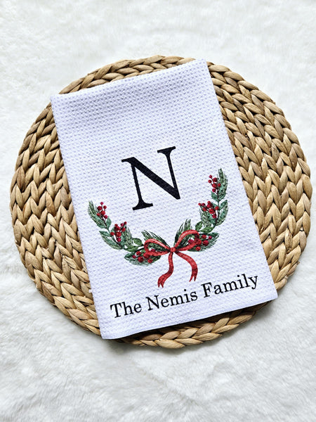To order this kitchen towel please include the family name and initial you want in the Personalization box below.