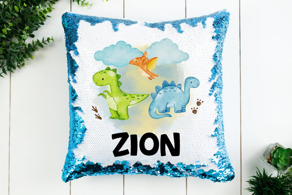 Brighten up your child's room with a personalized name sequin pillow with cute dinosaur print.