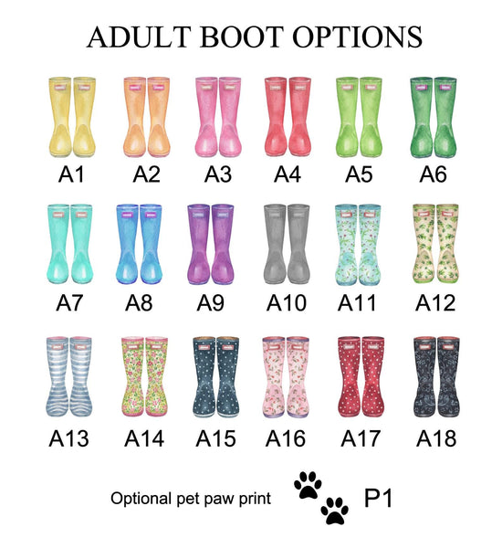 Boot and names will be printed in order from left to right. P1 is the pet paw print option for the pets.