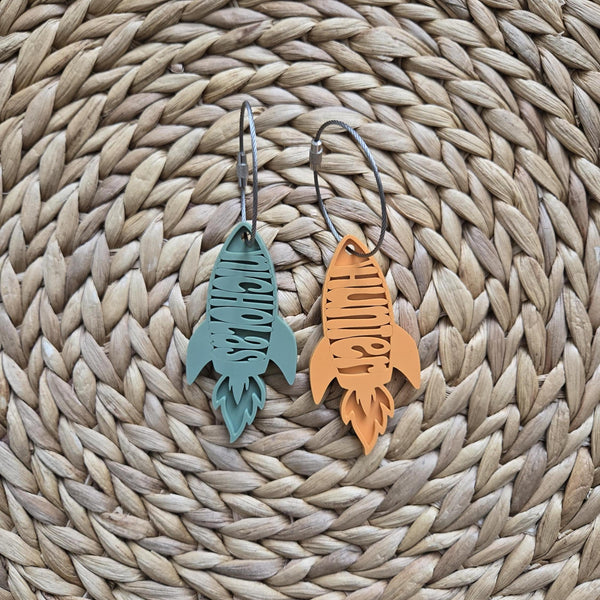 Personalized and custom made Acrylic Rocket Ship Name Tag. These keychains are perfect for back to school bags, luggage tags, diaper bags and for birthday loot bags.